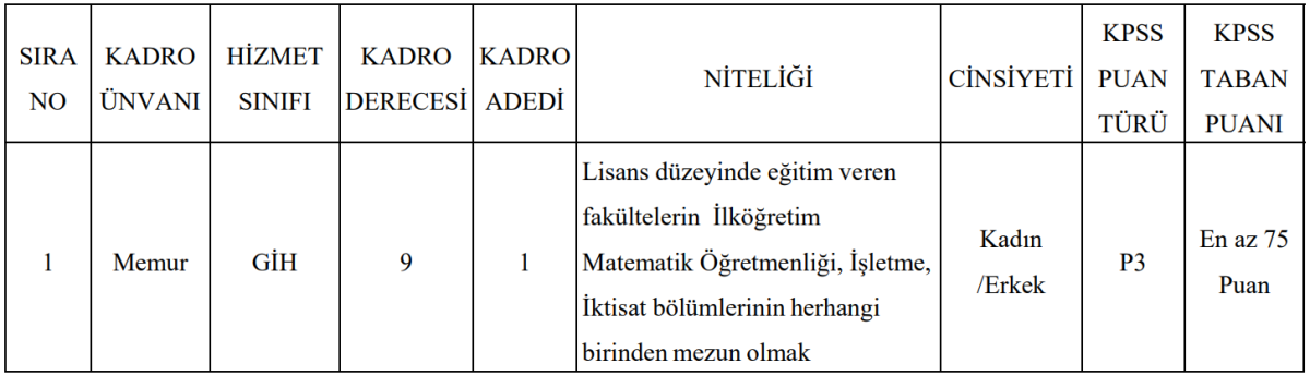 Lisans mezunu adayların başvuru yapabileceği alımda, KPSS puanı ve sözlü sınav süreci belirleyici olacak. Kadroya atanmak isteyen adayların hem genel şartları hem de ilan edilen özel nitelikleri taşıması gerekiyor.