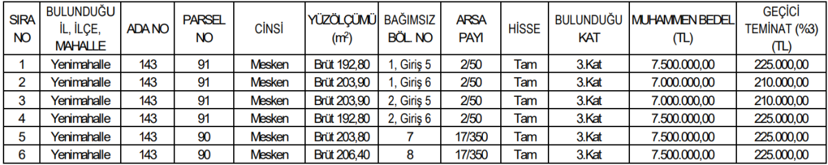 Yenimahalle 143 ada 91 parselde bulunan dört dairenin brüt alanları 192,80 metrekare ve 203,90 metrekare olarak açıklandı. Bu taşınmazların muhammen bedelleri 7 milyon TL ve 7,5 milyon TL olarak belirlendi.