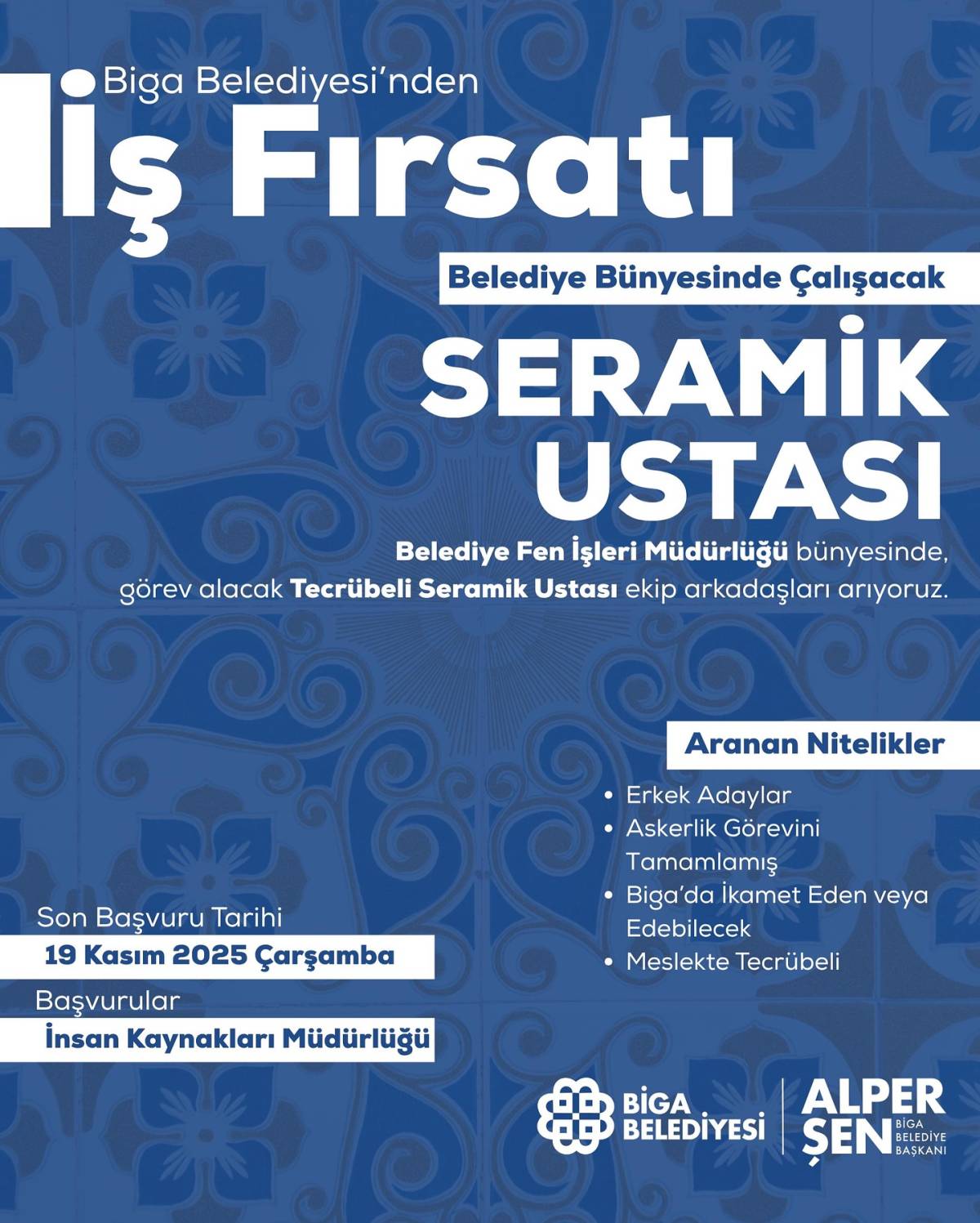 Biga Belediyesi tarafından yayımlanan ilana göre seramik ustası pozisyonuna başvuruda bulunmak isteyen adaylarda bazı temel kriterler aranıyor. Adayların öncelikle erkek olması ve askerlik görevini tamamlamış bulunması gerekiyor. Bunun yanı sıra, ilçede görev yapacağından dolayı Biga’da ikamet eden veya edebilecek durumda olmak başvuru şartları arasında yer alıyor.
