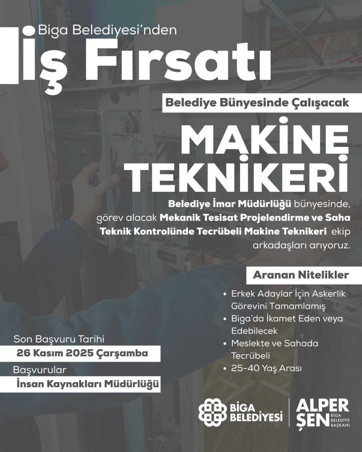 Biga Belediyesi, mekanik tesisat projelendirme ve saha teknik kontrolünde görev alacak Makine Teknikeri adaylarını bekliyor. Son başvuru tarihi 26 Kasım 2025 Çarşamba olarak duyuruldu.