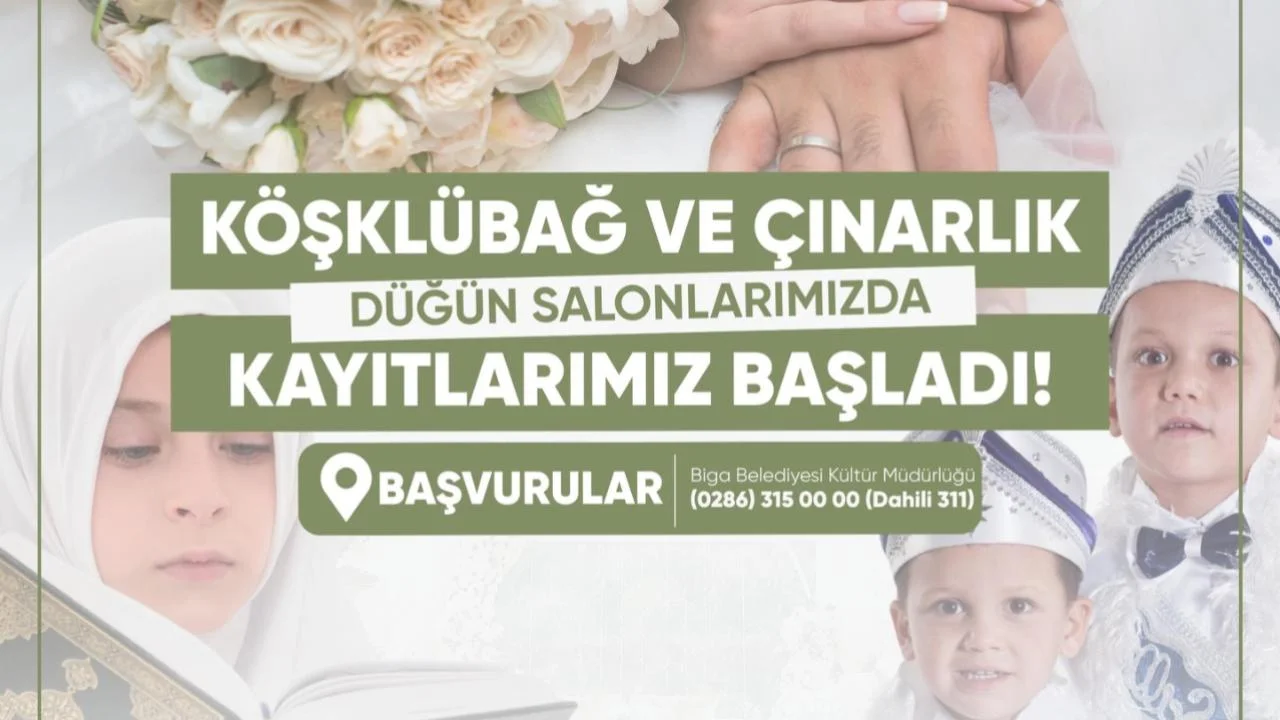 Biga Belediyesi, dünyaevine girmeye hazırlanan çiftler için Köşklübağ ve Çınarlık Düğün Salonları’nda 2026 yılı randevu kayıtlarının başladığını duyurdu.