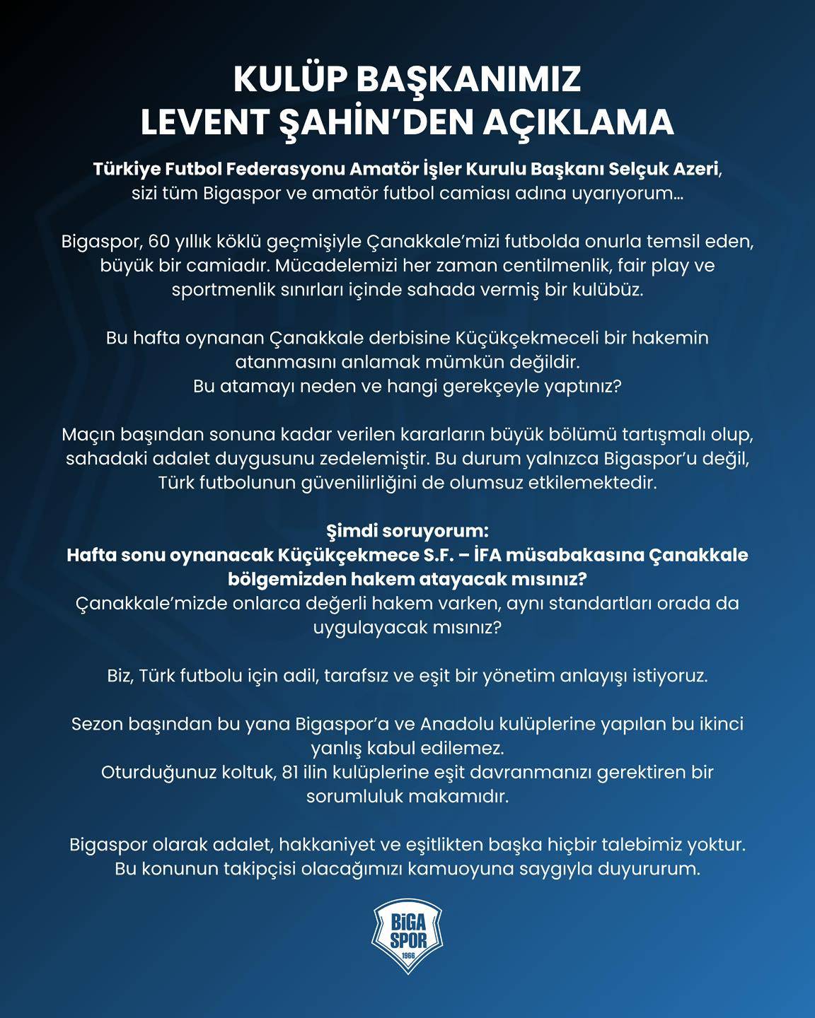 Kamuoyuna yapılan açıklamada Bigaspor’un tek talebinin “adalet, hakkaniyet ve eşitlik” olduğu açıkça ifade edildi.