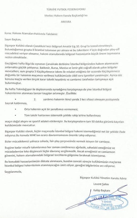 Dilekçe, Bigaspor Kulübü Yönetim Kurulu adına Kulüp Başkanı Levent Şahin tarafından imzalanarak MHK’ye iletildi. Yazının sonunda kulüp, taleplerinin dikkate alınması ve bundan sonraki süreçte İstanbul bölgesi hakemlerinin Bigaspor maçlarında görevlendirilmemesi yönündeki beklentisini yineledi.