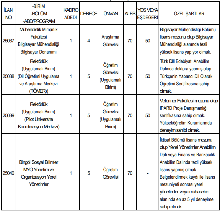 Bingöl Üniversitesi Rektörlüğü, öğretim üyesi dışındaki öğretim elemanı kadrolarına alım yapacağını duyurdu. Resmî açıklamaya göre, farklı fakülte ve yüksekokullarda görevlendirilmek üzere toplam 4 kişilik kadro için başvurular alınacak.
