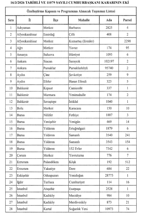 Listede Adıyaman’dan İstanbul’a, İzmir’den Muğla’ya, Sakarya’dan Tekirdağ’a kadar çok sayıda ilde bulunan taşınmazlar yer aldı. Bu taşınmazlar arasında farklı ilçelerde bulunan arsalar ve üzerindeki yapılar bulunuyor.