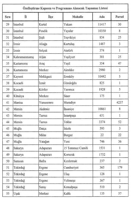 Karar kapsamında Türkiye’nin farklı bölgelerinde bulunan toplam 55 taşınmaz ve üzerindeki yapılar özelleştirme kapsam ve programına dahil edildi.