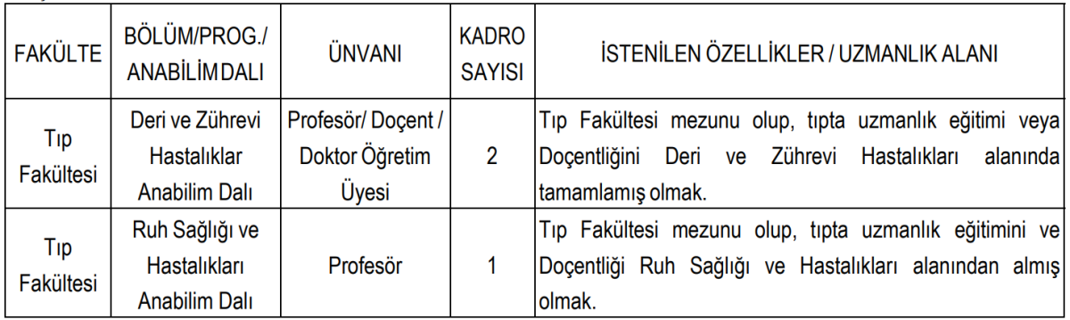 Deri ve Zührevi Hastalıkları Anabilim Dalı için profesör, doçent veya doktor öğretim üyesi kadrolarında iki kişi alınacak. Ayrıca Ruh Sağlığı ve Hastalıkları Anabilim Dalı için bir profesör kadrosu bulunuyor.