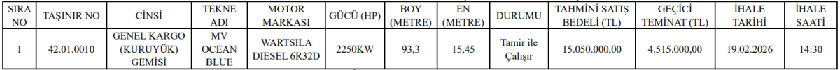 İlan metninde ayrıca geminin bağlama kütüğü uygunluğuna ilişkin değerlendirme yapılmadığı ve satış sonrası bağlama kütüğü düzenlenememesi durumunda idarenin sorumluluk kabul etmeyeceği bilgisi paylaşıldı.