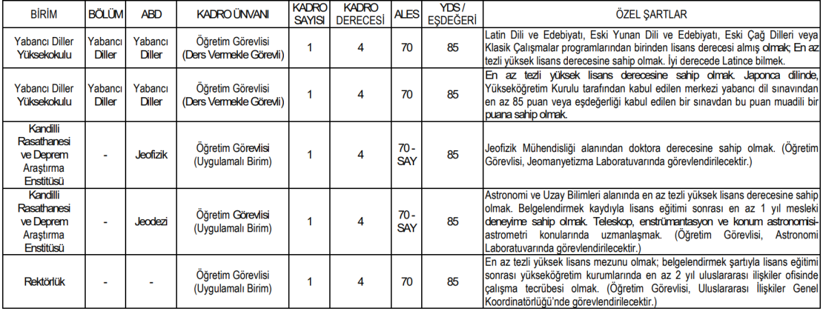 Boğaziçi Üniversitesi’nin ilanında yer alan kadrolar ve özel şartlar şu şekilde açıklandı: