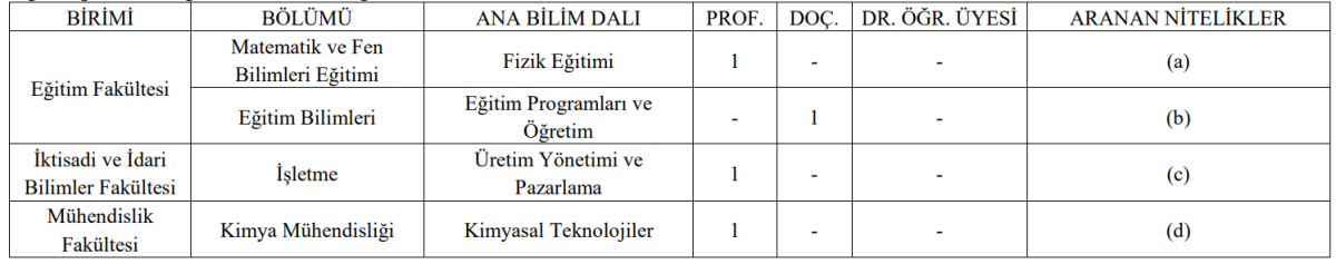 Üniversitenin açıklamasına göre, alımlar tam zamanlı statüde gerçekleştirilecek ve adaylardan belirtilen akademik koşulların yanı sıra yabancı dil yeterliliği de talep edilecek.