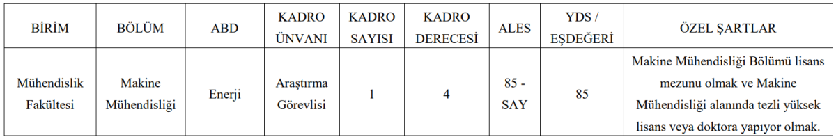 Enerji Anabilim Dalı (Araştırma Görevlisi): 1 araştırma görevlisi alınacak. Adayların Makine Mühendisliği lisans mezunu olmaları ve bu alanda tezli yüksek lisans veya doktora yapıyor olmaları gerekiyor. Başvurular için ALES sayısal puanından en az 85, YDS veya eşdeğer bir yabancı dil sınavından en az 85 puan alınması şart koşuluyor.
