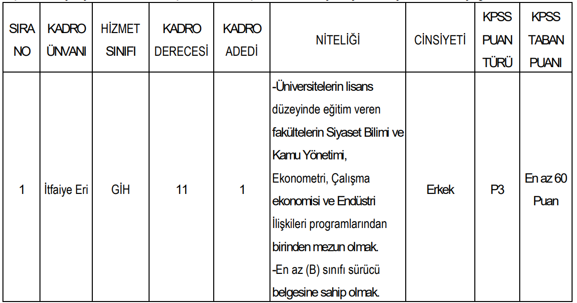 Eleşkirt Belediyesi’nin yayımladığı ilana göre, Genel İdare Hizmetleri (GİH) sınıfında, 11. derece kadro için 1 adet itfaiye eri alınacak.