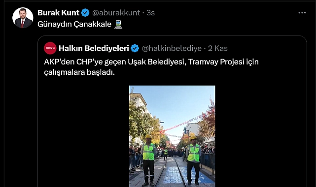 İYİ Parti’nin 31 Mart yerel seçimlerinde Çanakkale Belediye Başkan adayı olan Burak Kunt, Uşak’taki gelişmelere esprili bir dille “Günaydın Çanakkale” diyerek yanıt verdi. Bu tepki, aynı zamanda kendi seçim kampanyasında da önemli bir yere sahip olan Çanakkale tramvay projesine bir göndermeydi. Kunt’un 2024 yerel seçimlerinde sunduğu Çanakkale tramvay projesi, Çanakkale’de toplu taşıma sorunlarına çözüm getirmeyi hedefliyordu. Ancak, CHP yönetimindeki belediye bu projeyi “olmaz” gözüyle değerlendirmişti.