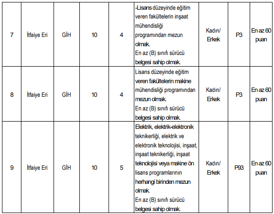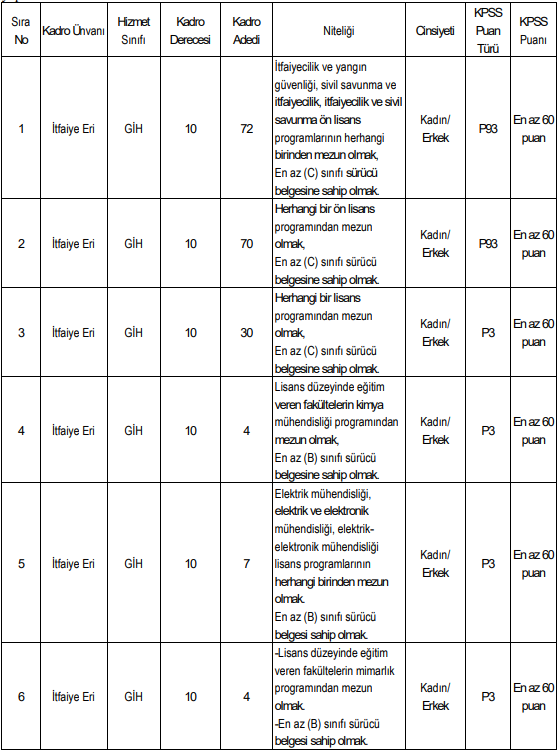 İtfaiyecilik ve yangın güvenliği / sivil savunma ve itfaiyecilik / itfaiyecilik ve sivil savunma ön lisans mezunları için 72 kadro, en az C sınıfı sürücü belgesi şartı aranıyor.