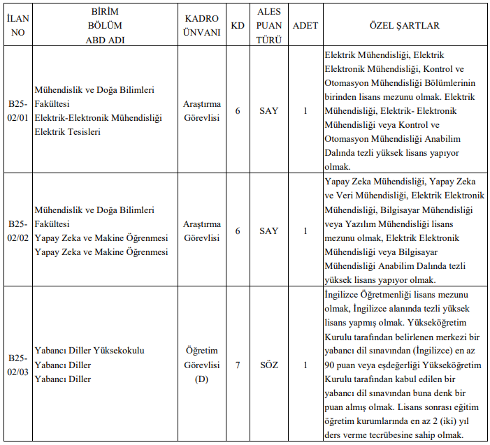 Bursa Teknik Üniversitesi aynı ilan kapsamında, Mühendislik ve Doğa Bilimleri Fakültesi ile Orman Fakültesi bünyesinde profesör ve doçent kadroları için de alım yapacağını duyurdu.