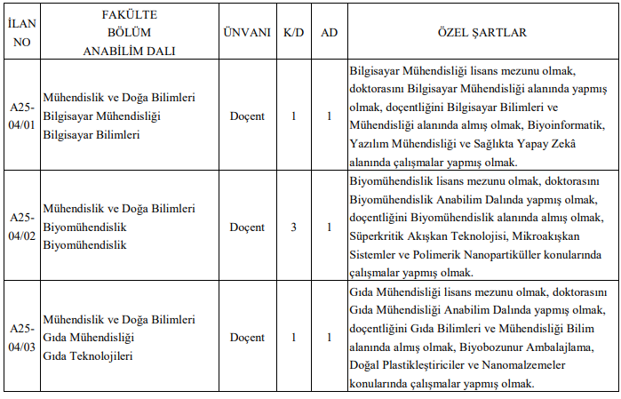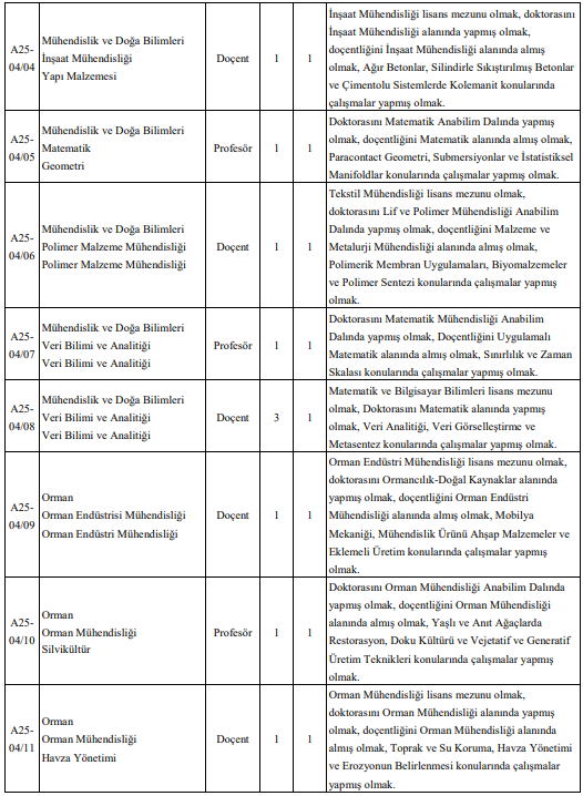 Bilgisayar Mühendisliği, Biyomühendislik, Gıda Mühendisliği, İnşaat Mühendisliği, Matematik, Polimer Malzeme Mühendisliği, Veri Bilimi ve Analitiği, Orman Endüstrisi Mühendisliği, Orman Mühendisliği bölümlerinde doçent ve profesör kadroları bulunuyor.