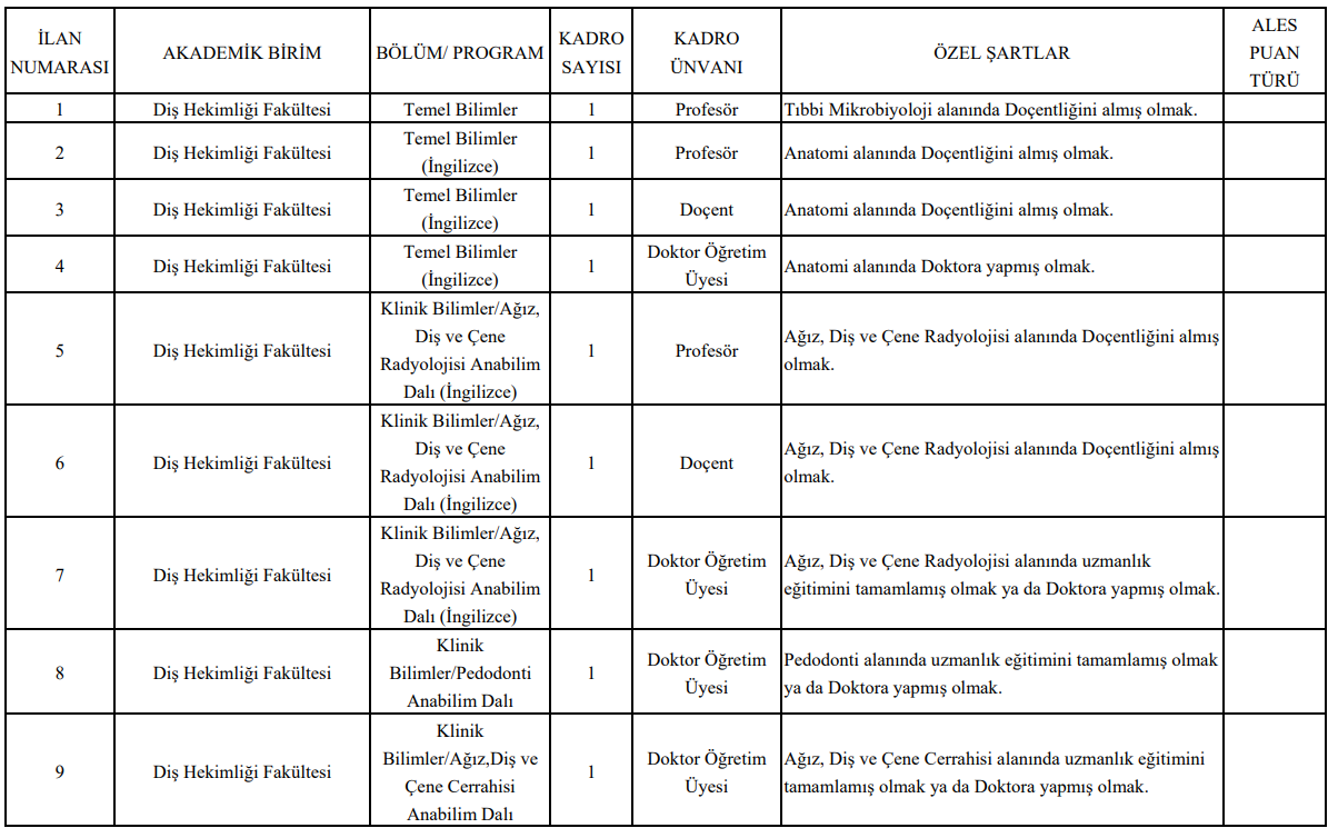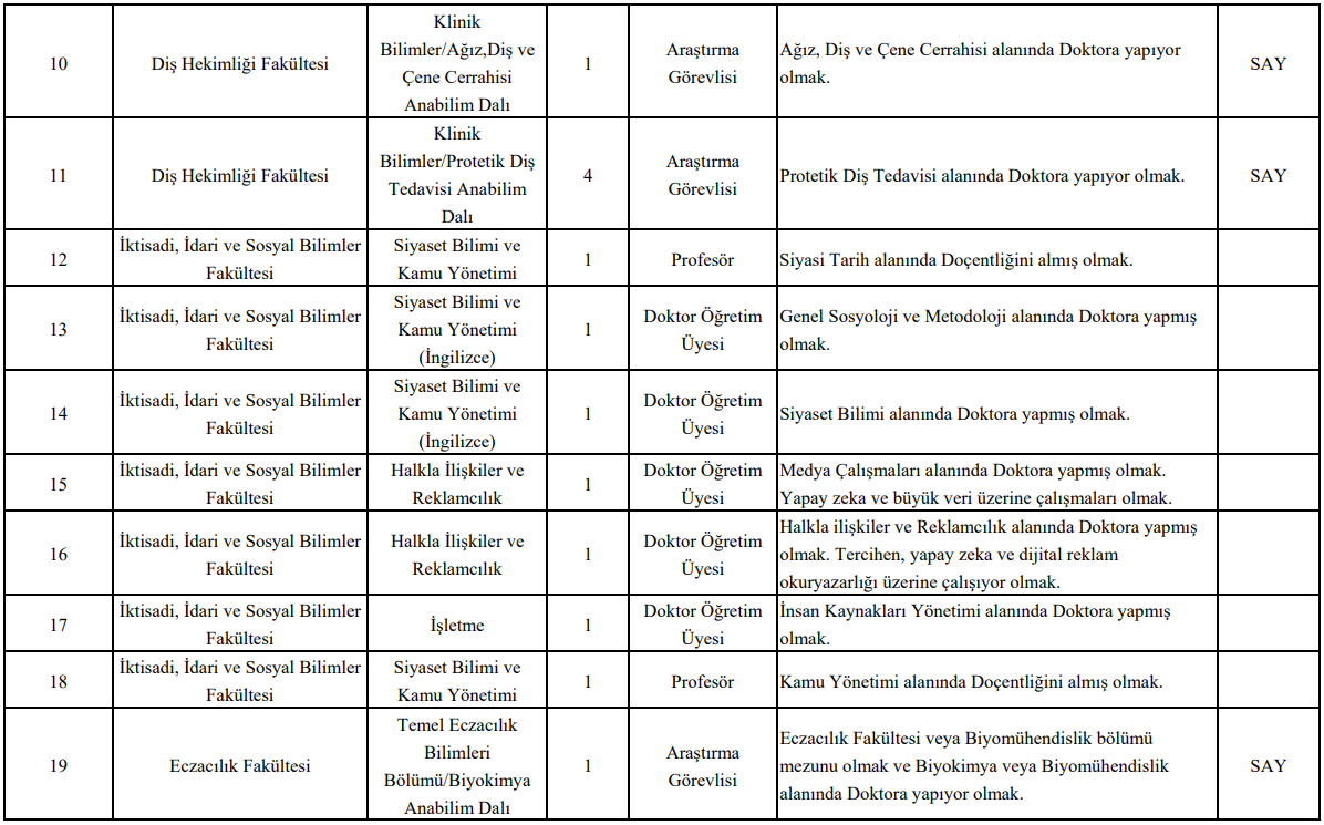 İlan kapsamında çok sayıda fakülte ve akademik birimde alım yapılacak. Kadro açılan başlıca birimler arasında şunlar yer alıyor: