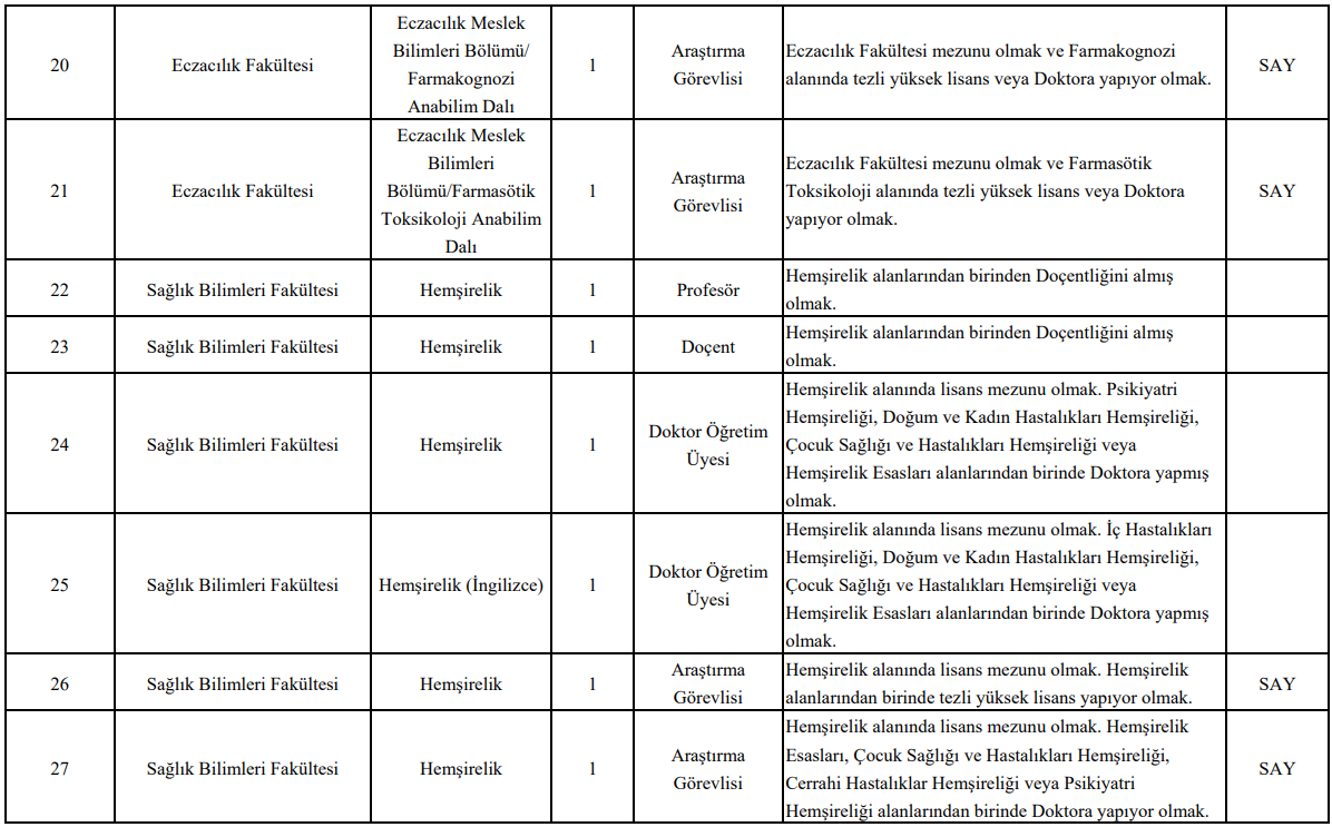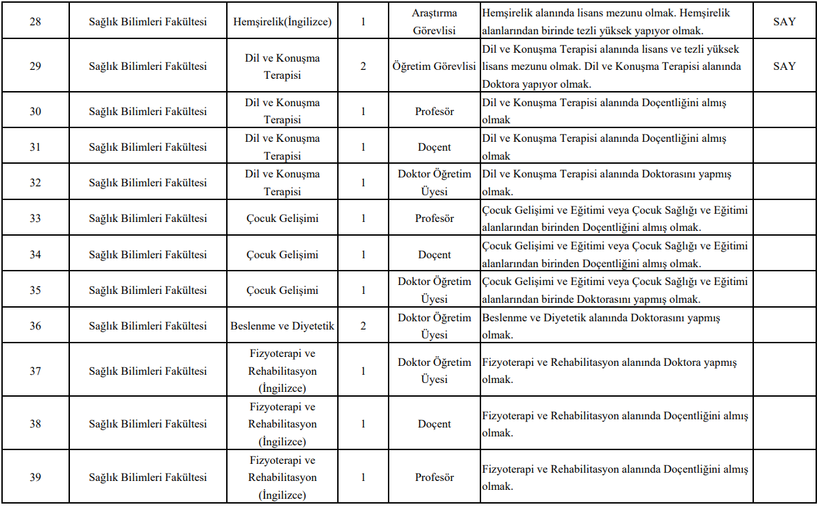 İlana başvuracak adayların, başvurdukları unvana göre belirlenen akademik yeterlilikleri sağlamaları gerekiyor. Profesör ve doçent kadroları için doçentlik belgesi şartı aranırken; doktor öğretim üyesi, öğretim görevlisi ve araştırma görevlisi kadrolarında doktora, tezli yüksek lisans veya ilgili alanda öğrenci olma şartları bulunuyor.