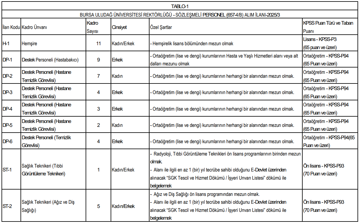 Bursa Uludağ Üniversitesi tarafından yayımlanan ilana göre, farklı öğrenim düzeylerinden toplam 62 sözleşmeli personel alınacak. Kadrolar ve kontenjanlar şu şekilde sıralanıyor: