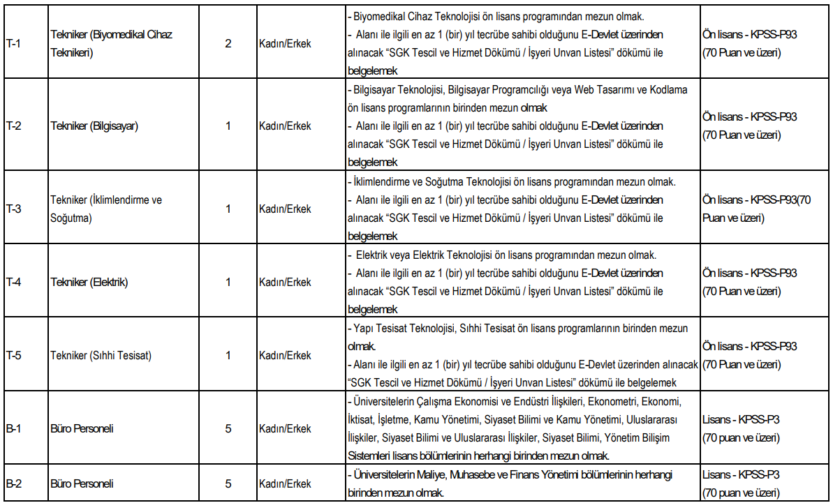 Sağlık teknikeri ve teknik personel kadrolarında ilgili programdan mezuniyet şartı aranıyor.