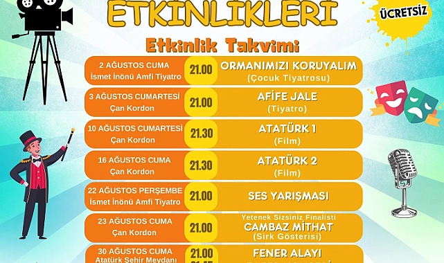 Ağustos ayı etkinlikleri, "Ormanımızı Koruyalım" çocuk tiyatrosu ile başlayacak. Etkinlikler arasında ayrıca Fener Alayı, Zafer Konseri, Atatürk Film Gösterimi, Afife Jale Tiyatro Gösterimi ve Cambaz Mithat Sirk Gösterimi yer alacak.