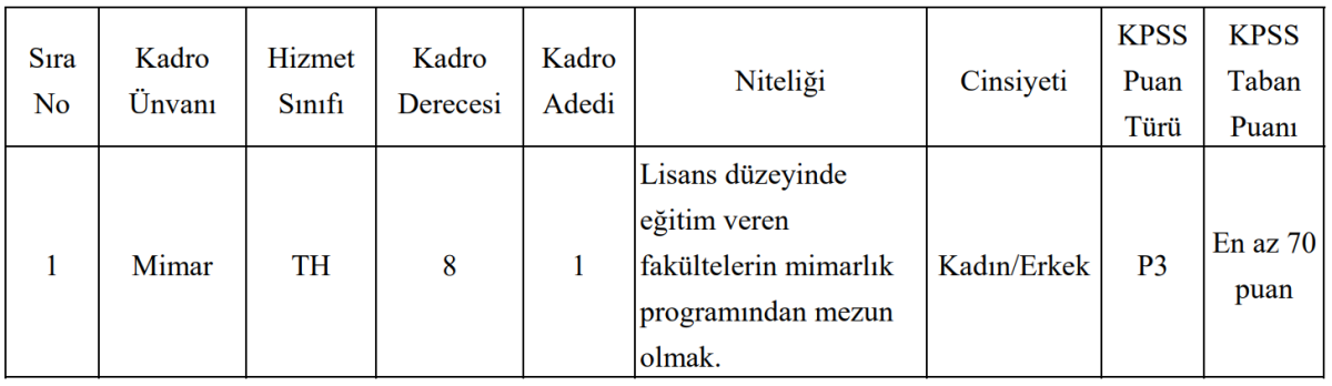 İlana göre Çanakkale Belediyesi, Teknik Hizmetler Sınıfı’nda yer alan 8’inci derece mimar kadrosu için 1 personel alımı yapacak. Kadroya başvuracak adayların lisans düzeyinde eğitim veren fakültelerin mimarlık bölümünden mezun olması şartı aranıyor. Kadro için kadın ve erkek adaylar başvuru yapabilecek.