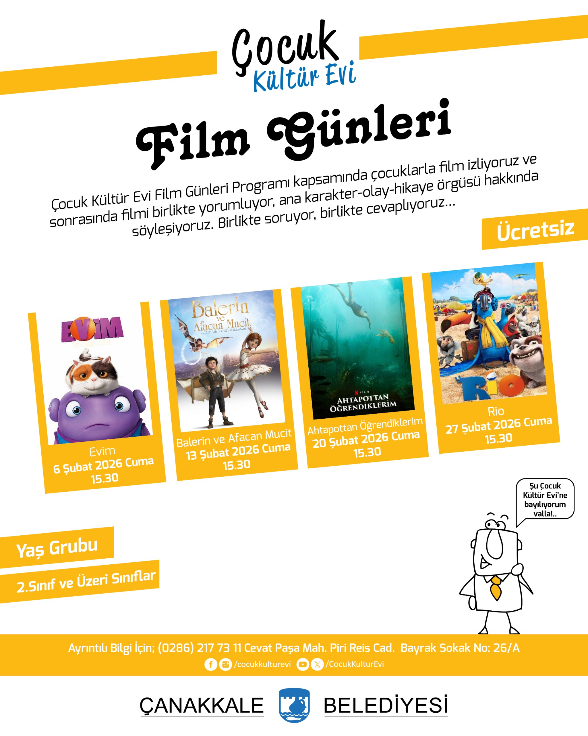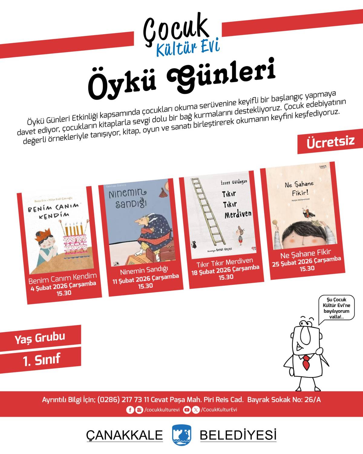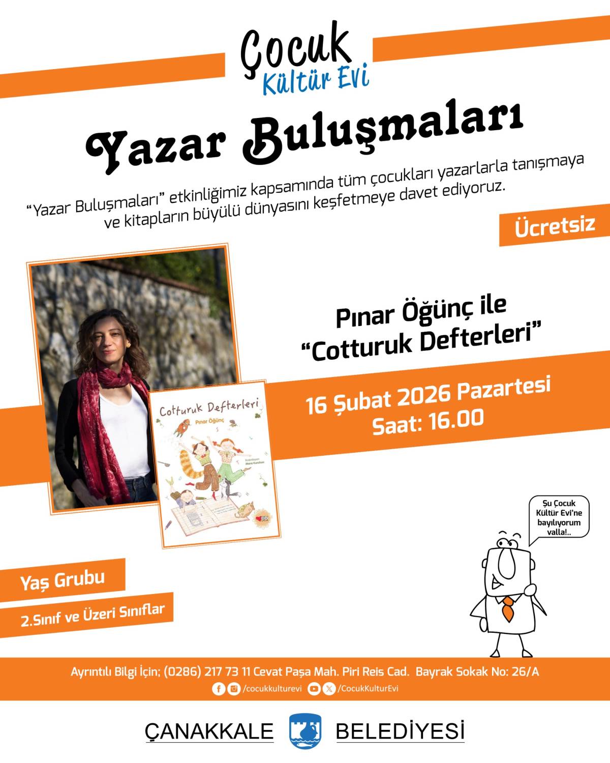 Ayrıntılı Bilgi için Çocuk Kültür Evi; (0286) 217 73 11 Cevat Paşa Mah. Piri Reis Cad. Bayrak Sokak No: 26/A