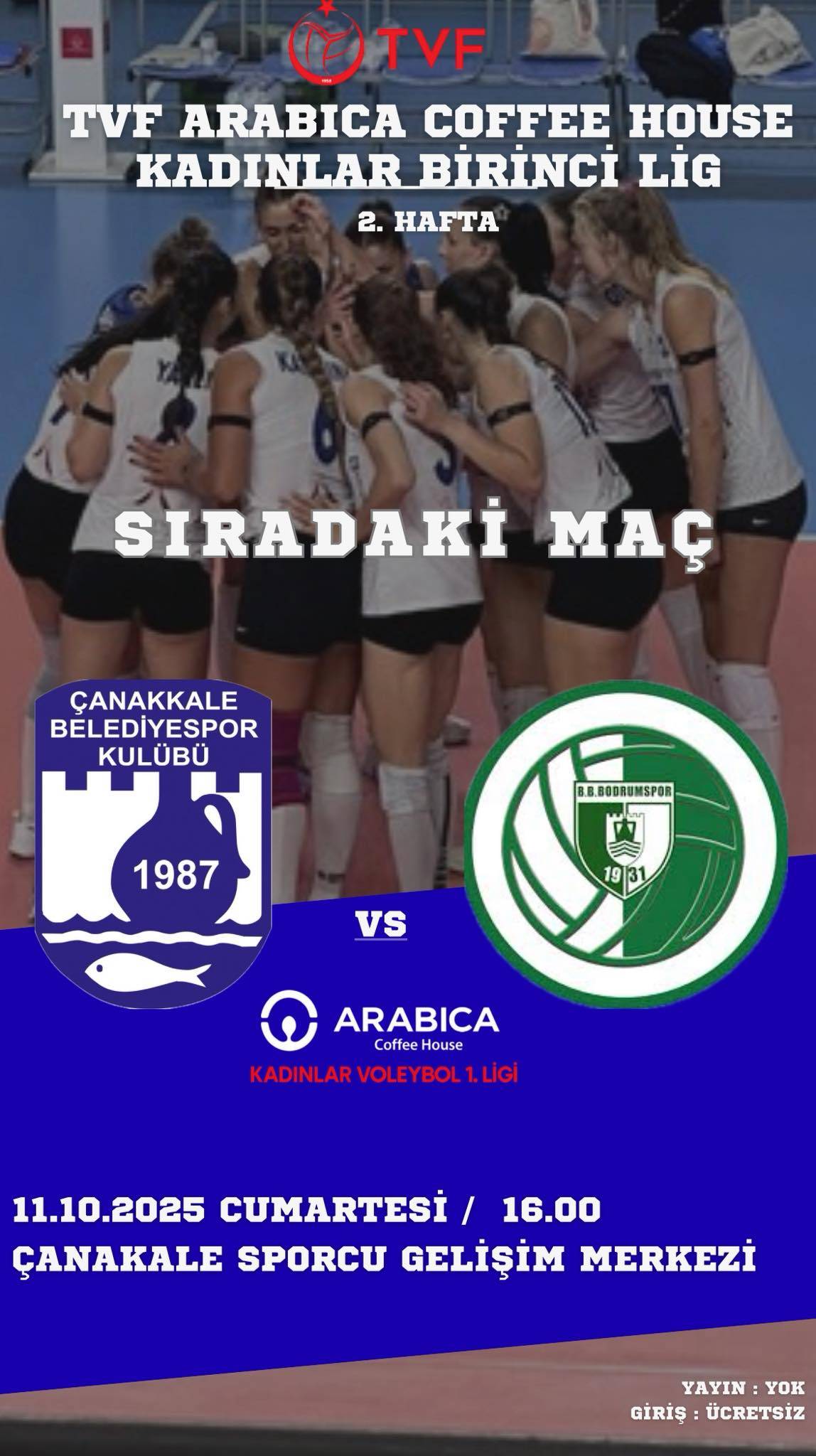 Çanakkale Belediyespor Kulübü, Türkiye Voleybol Federasyonu Arabica Coffee House Kadınlar 1. Ligi 2. haftasında Bodrum Bld Bodrumspor ile karşı karşıya geliyor. Maç, 11 Ekim 2025 Cumartesi günü saat 16.00’da Çanakkale Sporcu Gelişim Merkezi’nde oynanacak.