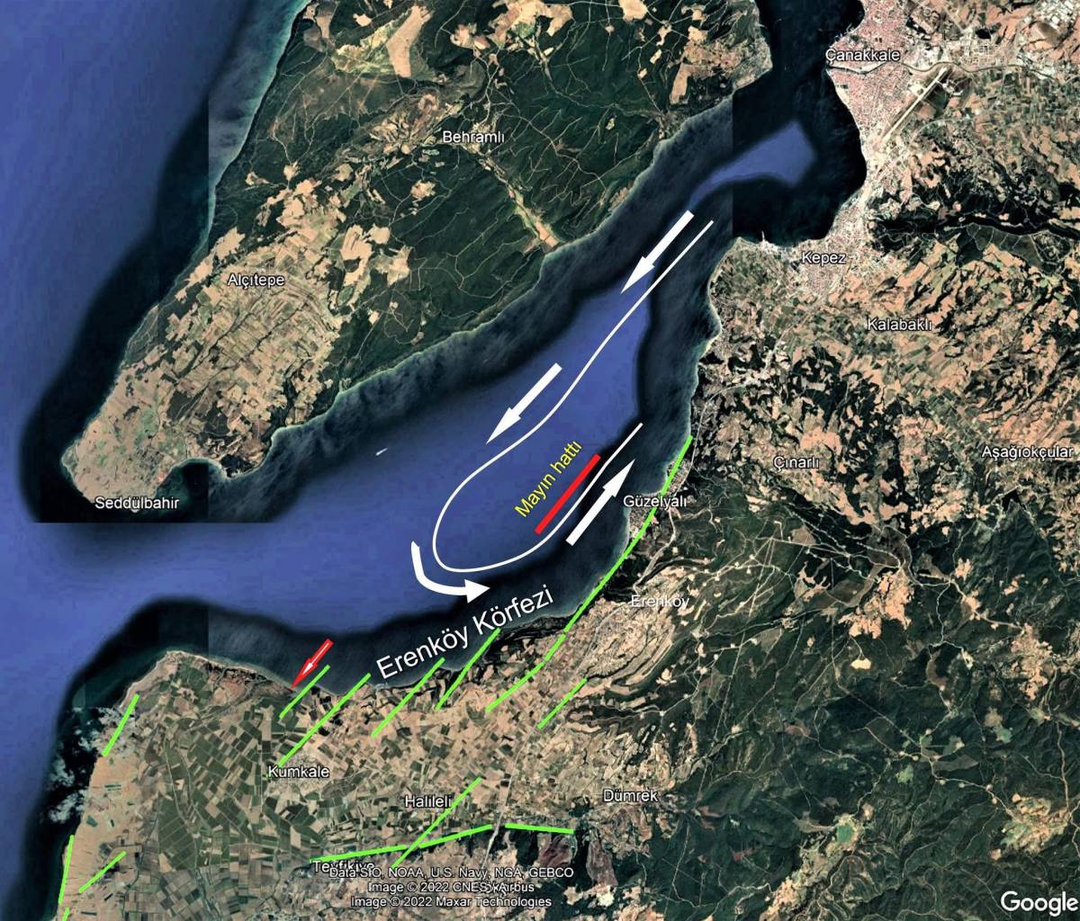Ters akıntının sebebinin Karamenderes Nehri’nden boğaza karışan tatlı su olduğunu söyleyen Perinçek, “Kumkale yakınlarında denize boşalan Karamenderes’in tatlı suyu, tuzlu deniz suyuna göre daha hafif olduğu için Marmara yönünde ters akıntı oluşturuyor.” dedi.