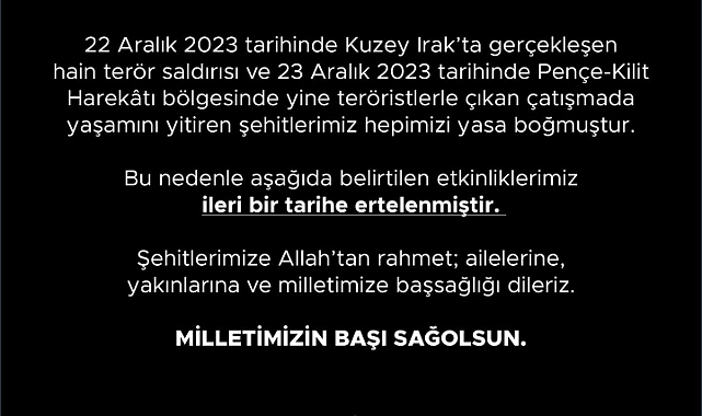 Çanakkale Belediyesi tarafından yapılan duyuruda; “ 22 Aralık 2023 tarihinde Kuzey Irak’ta gerçekleşen hain terör saldırısı ve 23 Aralık 2023 tarihinde Pençe-Kilit Harekâtı bölgesinde yine teröristlerle çıkan çatışmada yaşamını yitiren şehitlerimiz hepimizi yasa boğmuştur. Bu nedenle aşağıda belirtilen etkinliklerimiz ileri bir tarihe ertelenmiştir.