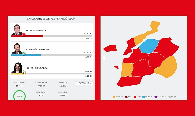 Çanakkale’deki seçim sonucunda İYİ Parti adayı Burak Kunt ise %36,89 oy oranına sahipken AK Parti adayı Jülide İskenderoğlu seçimde %18,27 oranında bir oy aldı.