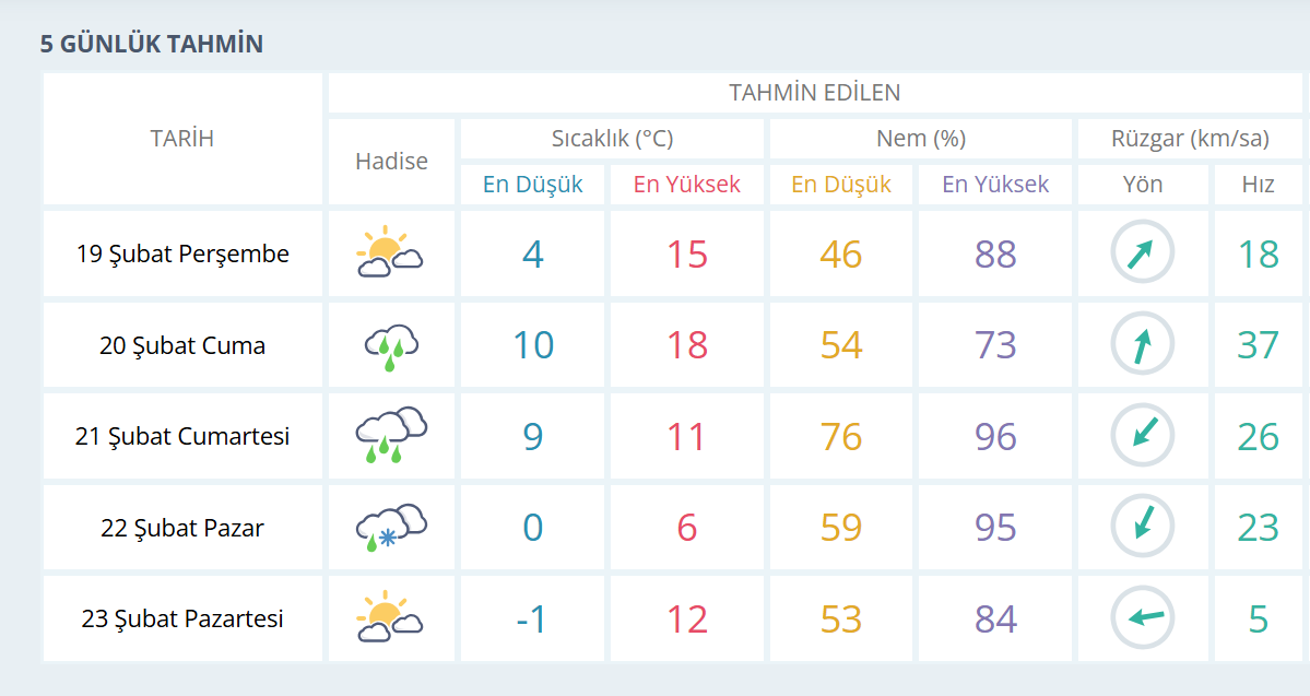 Çanakkale 5 Günlük Hava Durumu Tablosu