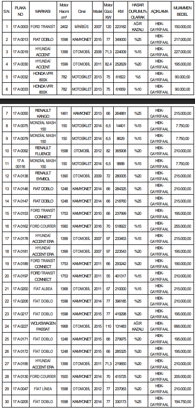 Toplam 30 aracın marka, model, kilometre, hasar durumu ve muammen bedelleri ilan metninde kalem kalem açıklandı. Araçlar arasında Ford Transit minibüslerden Fiat Doblo kamyonetlere, Hyundai Accent otomobillerden motosikletlere kadar geniş bir yelpaze bulunuyor. Muammen bedeller 7.750 TL ile 666.000 TL arasında değişiyor.