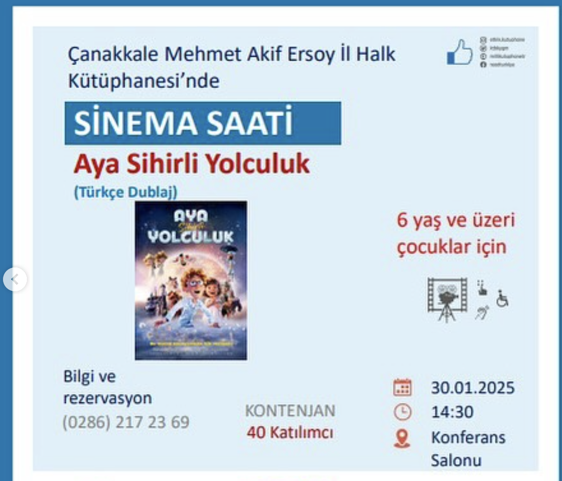 Çanakkale Mehmet Akif Ersoy İl Halk Kütüphanesi, çocuklara eğlenceli ve öğretici bir sinema deneyimi sunuyor. 30 ve 31 Ocak tarihlerinde kütüphanenin konferans salonunda, 6 yaş ve üzeri çocuklar için iki özel animasyon filmi gösterilecek.