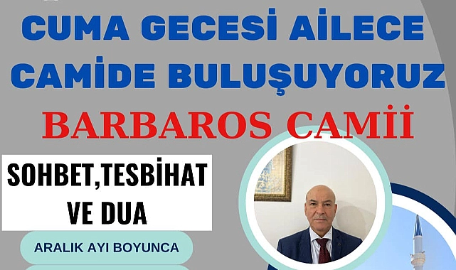 Çanakkale İl Müftülüğü, Aralık ayı boyunca Barbaros Camii'nde "Cuma Gecesi Ailece Camide Buluşuyoruz" etkinliği düzenliyor. Etkinlikte, yatsı namazından önce Uzman Vaiz Aydın Doğruay eşliğinde sohbet, tesbihat ve dua yapılacak.
