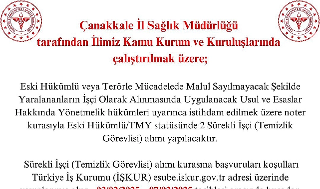 Başvurular, 03-07 Şubat 2025 tarihleri arasında Türkiye İş Kurumu (İŞKUR) üzerinden gerçekleştirilecek. Kura çekimi ise 13 Şubat 2025, saat 14:00'te Çanakkale İl Sağlık Müdürlüğü'nde yapılacak.
