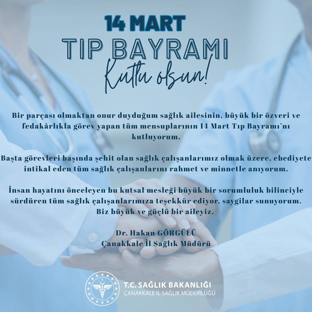 Çanakkale İl Sağlık Müdürü Dr. Hakan Görgülü, 14 Mart Tıp Bayramı dolayısıyla yayımladığı mesajda sağlık çalışanlarının toplum için üstlendiği hayati role dikkat çekti. Sağlık hizmetlerinin her aşamasında görev yapan çalışanların büyük bir özveri ve fedakârlıkla insan hayatını önceleyen bir anlayışla görev yaptığını belirten Görgülü, tüm sağlık çalışanlarının Tıp Bayramı’nı kutladı.