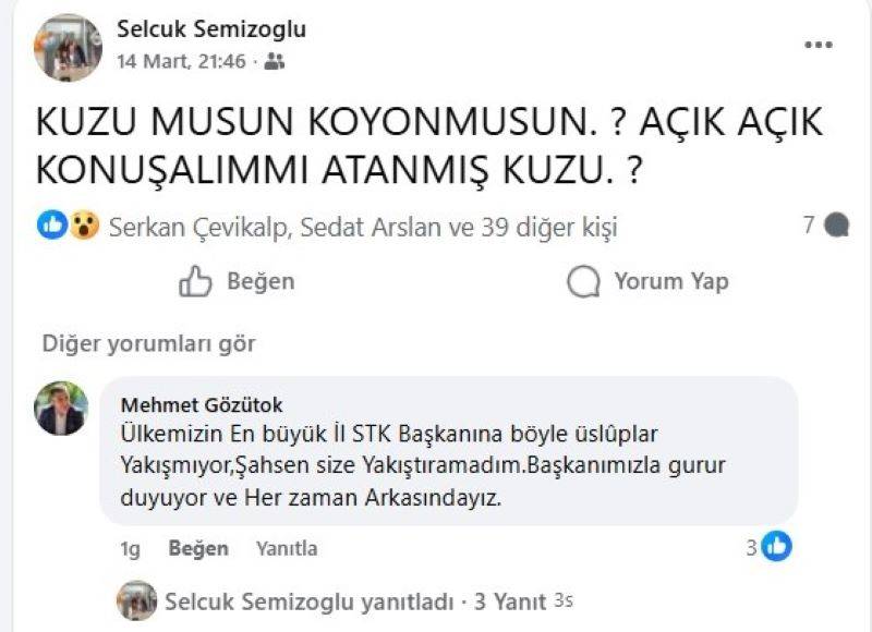 Her şey, ÇTSO Başkanı Selçuk Semizoğlu’nun 14 Mart akşamı saat 21:46 sularında yaptığı bir paylaşımla başladı. Semizoğlu, büyük harflerle kaleme aldığı gönderisinde: “KUZU MUSUN KOYON MUSUN? AÇIK AÇIK KONUŞALIM MI ATANMIŞ KUZU?” ifadelerini kullandı.