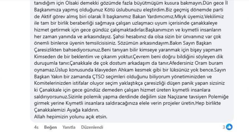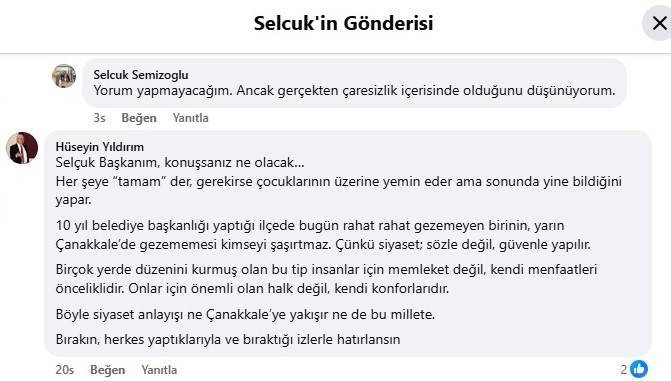 Hüseyin Yıldırım: Paylaşımın altına oldukça sert bir eleştiri bırakan Yıldırım, isim vermeden Abdurrahman Kuzu’yu kastederek belediye başkanlığı dönemine atıfta bulundu. Yıldırım, "10 yıl belediye başkanlığı yaptığı ilçede bugün rahat rahat gezemeyen birinin, yarın Çanakkale’de gezememesi kimseyi şaşırtmaz. Siyaset sözle değil, güvenle yapılır" diyerek tartışmaya farklı bir boyut kazandırdı.