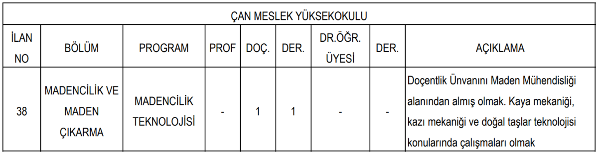 İptal edilen kadro ilanı, Çanakkale Onsekiz Mart Üniversitesi’ne bağlı Çan Meslek Yüksekokulu bünyesinde yer alan Madencilik ve Maden Çıkarma Bölümü – Madencilik Teknolojisi Programı için açılan öğretim üyesi kadrosunu kapsıyor.