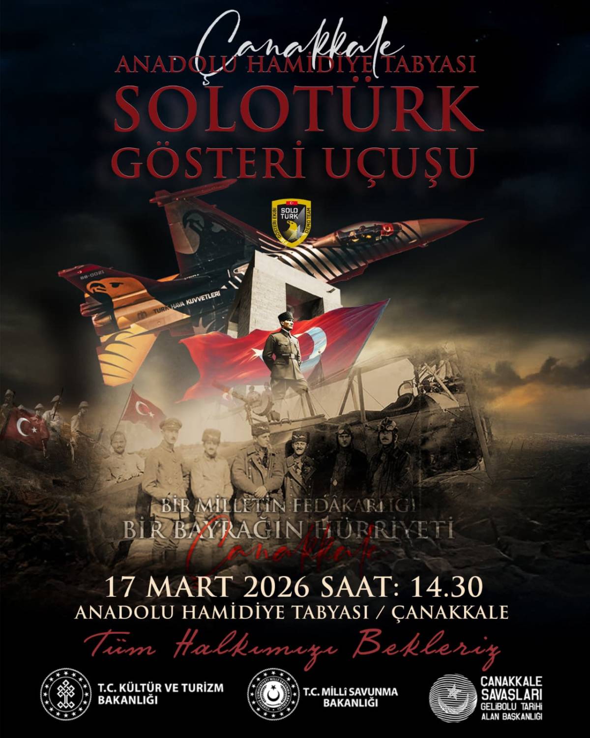 Etkinlik, tarihi atmosferiyle öne çıkan Anadolu Hamidiye Tabyası’nda düzenlenecek. 17 Mart’ta yapılacak program kapsamında SoloTürk, saat 14.30'da Çanakkale semalarında akrobasi gösterisi sunacak.