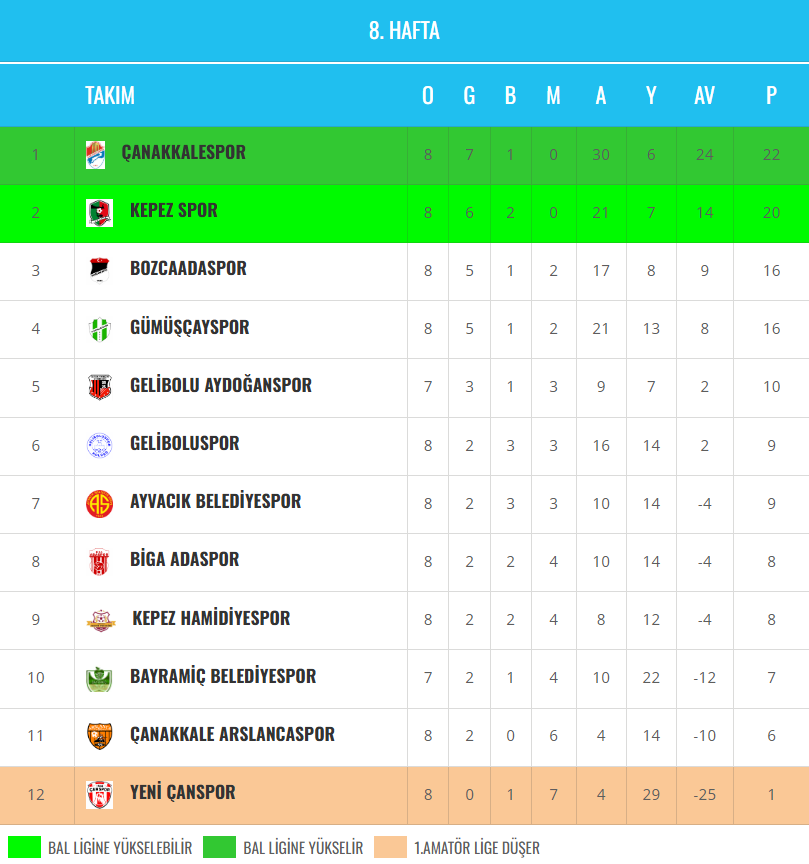 Çanakkale Süper Amatör Lig’de 8. haftanın geride kalmasıyla birlikte ligde heyecan daha da yükseldi. Takımlar hem üst sıralar hem de alt sıralar için kritik puanlar toplamaya çalışırken, sahalarda rekabet üst seviyede yaşanmaya devam ediyor. Önümüzdeki haftalarda alınacak sonuçlar ligde dengeleri yeniden belirleyecek.