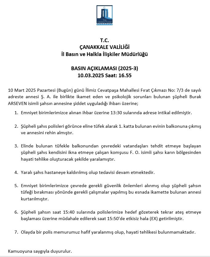 Yapılan açıklamada; "10 Mart 2025 Pazartesi (Bugün) günü İlimiz Cevatpaşa Mahallesi Fırat Çıkmazı No: 7/3 de sayılı adreste annesi Ş. A. ile birlikte ikamet eden ve psikolojik sorunları bulunan şüpheli Burak ARSEVEN isimli şahsın annesine şiddet uyguladığı ihbarı üzerine;