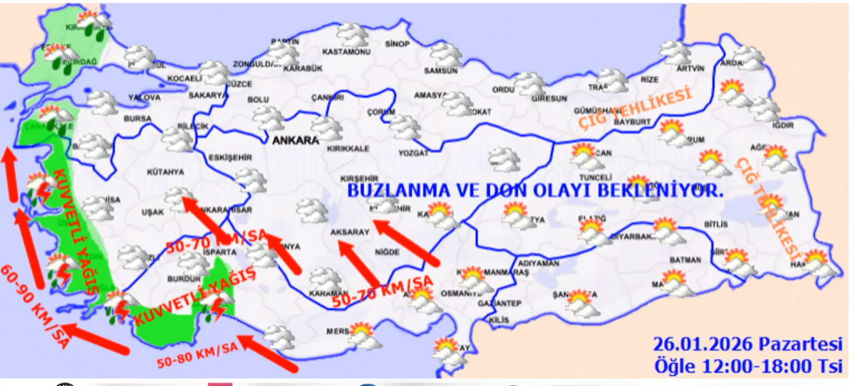 Meteoroloji Genel Müdürlüğü’nden Çanakkale ve çevre iller için kritik uyarı geldi! 26 Ocak Pazartesi günü (bugün) öğle saatlerinden itibaren bölge genelinde hava şartlarının sertleşmesi bekleniyor. Hem kuvvetli yağış hem de fırtına uyarısının aynı anda yapıldığı bölgede, vatandaşların yaşanabilecek olumsuzluklara karşı "en üst düzeyde" tedbirli olması istendi.