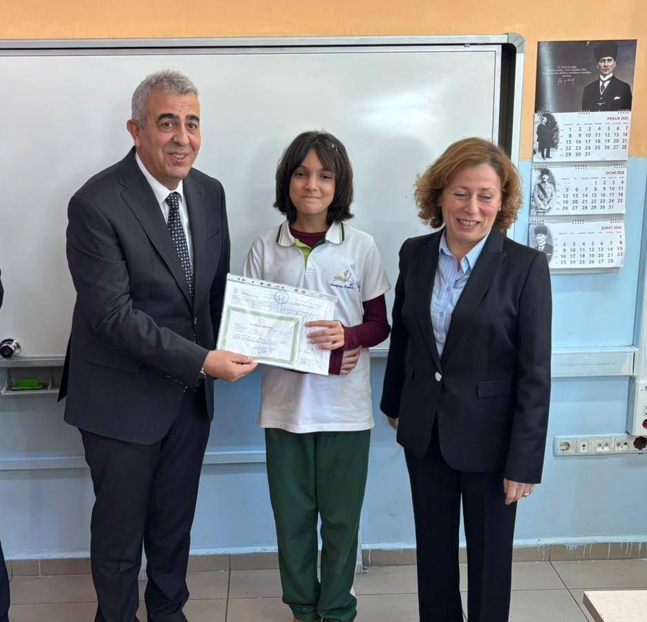 Törende öğrencilerle yakından ilgilenen protokol üyeleri, sınıfları ziyaret ederek karneleri öğrencilere takdim etti. Karne alan öğrencilerin heyecanı ve mutluluğu törene yansıdı.