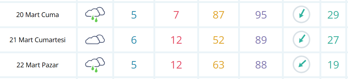 Bayramın son günü olan 22 Mart Pazar günü ise hava durumu yeniden "gri" moduna geri dönüyor. Hafif yağmurlu bir havanın beklendiği Pazar günü, sıcaklık 12 derece civarında sabit kalsa da nem oranının yüksekliği kapalı bir havayı beraberinde getirecek. Özellikle bayram tatili sonrası dönüş yoluna geçecek olan sürücülerin, yağışla birlikte kayganlaşan zemin ve görüş mesafesindeki düşüşe karşı ekstra dikkatli olması gerekiyor. Rüzgarın hızını saatte 19 kilometreye düşürmesi, deniz ulaşımında büyük bir aksama beklenmediğinin sinyallerini veriyor ancak yine de güncel duyuruları takip etmekte fayda var.