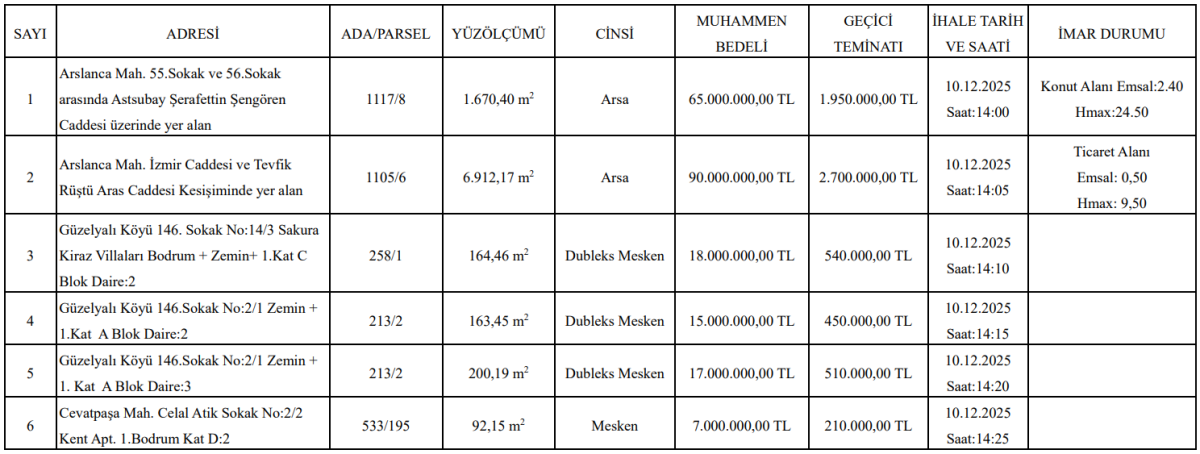 İlanda yer alan toplam altı taşınmaz, konumları, büyüklükleri ve imar özellikleriyle yatırımcıların ilgisini çekiyor.