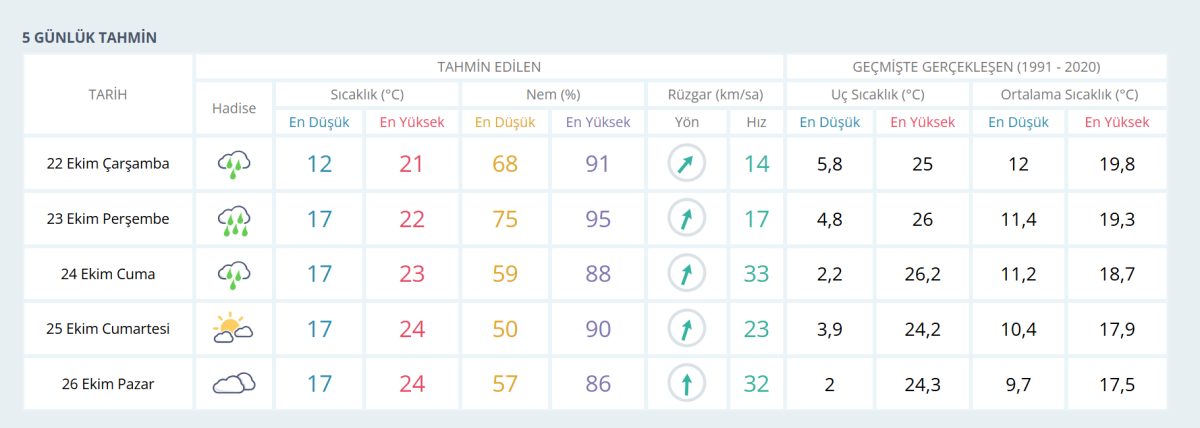 22 Ekim Çarşamba günü itibarıyla kent genelinde yağışlı hava etkisini sürdürecek. Sıcaklıklar 12°C ile 21°C arasında seyredecek. Nem oranının yüzde 90’lara kadar çıkması beklenirken, rüzgar saatte 14 kilometre hızla güneydoğudan esecek.