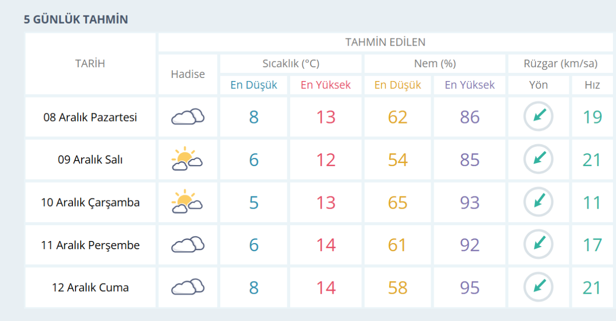 Haftanın son iş günü olan 12 Aralık Cuma günü de hava bulutlu olacak. En düşük sıcaklık 8 derece olarak beklenirken, rüzgâr hızının tekrar 21 km/sa seviyelerine çıkmasıyla kuvvetli rüzgâr etkisini sürdürecek.