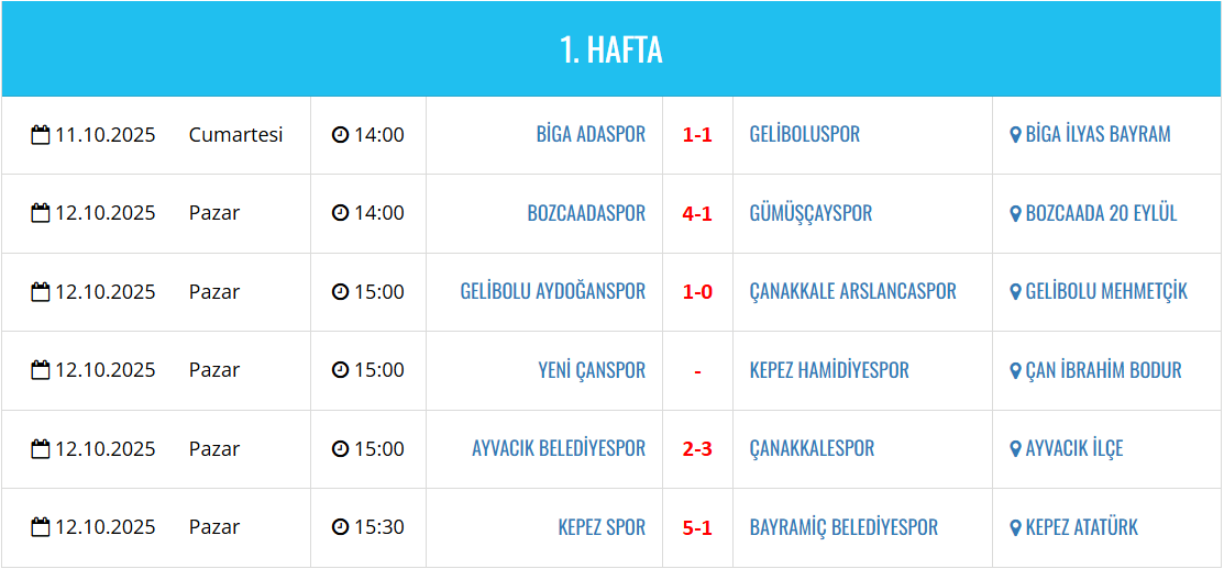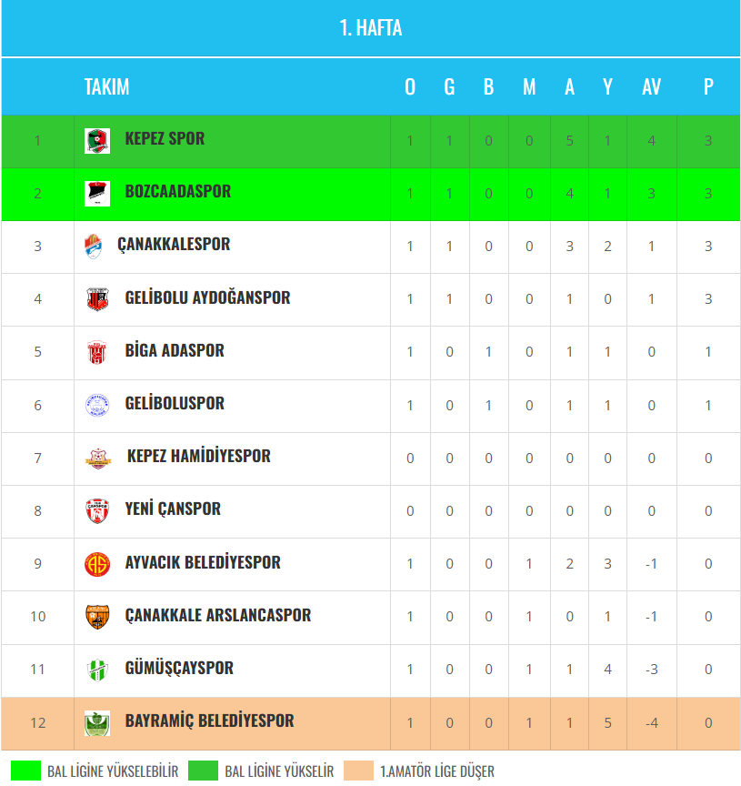 Çanakkale Süper Amatör Lig'de ilk hafta karşılaşmaları sonucunda oluşan puan tablosu şöyle;